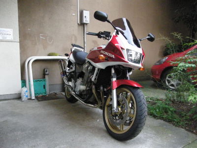 当初、金曜日に納車予定でしたが、「部品付けるだけなら早めに納車できるんでないかな?登録終わってるし…」と言うわけで、無理を承知で電話してみたら、木曜に納車できるとなりました。で、16時に部品の取り付け等が終わるので、その頃来て下さいと言われていたのですが、おいらが愛車とご対面するための入浴中に電話が来ていて、12時50分の時点で、納車できます!!ということでした。 急いで着替えて、バスと電車でGo!!14時ころ、ライコランド東雲に着きました。いや~、暑かった~。30℃いってなくても、15分も歩くと汗出ますね(^^ゞ ETCのセットアップとか色々済ませ、ナビを移設するときに使ったパーツ代を若干払い(1000円程度)、その後、ポイントたまったので商品券もらいました。そしたら何と!! 4万円分… バイク買ったからか!?と思い、聞いてみたらその通りとのこと。これで冬ジャケットが買えるぜ~♪期限ないから何か欲しくなったら買い物できるな♪といううはうはな会計(笑) で、1300では初公道ということで、変にアクセル開けてこけないようにと恐る恐る開けて行くと、「あれ?加速マイルド♪でっかい400に乗ってる気分♪」というわけで、何なく乗れました。まだフルバンクはできませんが、タイヤのはじっこ1cm残して曲がっていたみたいです。そのうち峠走りまくったら慣れるかな~ ところで、最初から付いていたSP忠男のマフラーなのですが、爆音ではなく、いい感じの音でした♪でっかい排気量の野太い排気音はいいものがありますね♪ 付属のSW-Motechのパニアとかトップケースも上々で、パニアのアタッチメント、必要ないとき外せて、元のバイクの形に戻るんです。これはいいな~と買ってから気づきました(笑)今はすっきりしたCB1300SBとなっています。まぁ、パニアケースなんてツーリング行く時しか付けないしね~ いいバイク買いました♪旧ボルちゃんよりたくさん乗るぞ~♪