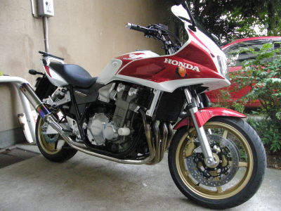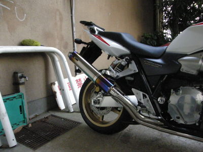 あれ?トップケースは?パニアケースは?と思いますが、全部外した状態で撮りました。トップケースはアダプターが残るだけ、パニアケースは、パニアを外して、アダプターは簡単取り外しができるので、外してあります。メーカーHPには、アダプターが残ると格好悪いから…ということで、取り外しできる仕様にしたとのことです。 愛車ほぼ正面です。スクリーンがでかい!! 斜め横から SP忠男のチタンマフラー 非常に乗りやすいバイクですが、やっぱ燃費悪い(笑)燃費出すために、100kmくらい走ってガソリン満タンしてみましたが、リッター14kmでした(涙) 高速クルージングだと延びるらしいです。 とりあえず、長時間乗っていても、以前のCBR600Fと違い、股が火傷するくらいに熱くなりません。400のころと変わらないかな?という感じですが、エンジンから上がってくる熱気は、やはり1300というわけで(^^ゞ とにかく乗りやすくて、1300だから気負うことあるんだろうな~…と思っていましたが、軽ーい街乗りでも気軽に乗れますし、いいバイク買ったな~と思います♪ これからよろしく~♪大事に乗るぜ!!