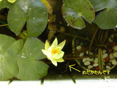 いつからか忘れましたが、メダカを飼うことに伴い、ネットで水蓮を購入し、数ヶ月が経ちました。水蓮の成長はとても早く、どんどん新しい新芽が出てきては、葉っぱが開きました(開く前は、ジュンサイに似ている)。そして夏が過ぎ、秋晴れの今日、ついに花が咲きました。黄色い綺麗な花です。めだかたんと共に写っています。いや~、いい物見れました。