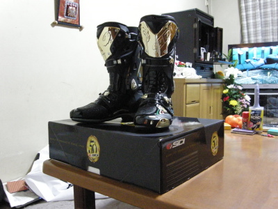 その後は、疲れてそっこう眠りました。久しぶりに体を使った疲れる行事だったので、ぐっすり♪ 今回のツーリング、いい景色、美味しい食べ物、楽しい道と、非常に中身の濃いものとなりました。誕生日後の幸先のいいツーリング。これからも、また安全運転で、今度は養老渓谷でも行ってみようかな?と思いました。千葉、結構いい感じのツーリングスポットですね♪ 昨日、ライコランド東雲店にウィンドウショッピングに行きました。そしたら、SIDIのVORTICEというナイスなブーツを見つけたのですが、現品処分でサイズが合わず、残念ながらあきらめました。 その後、家に帰ってナップスのHPをのぞいてみると、VORTICEあるではないですか!!さっそく電話をかけてみたのですが、お気に入りのカラーは無いということ。で、ちょっと妥協して、他のカラーも視野に入れてみることにしました。そしたら、広島とかにあるということなのです。 とりあえず、サイズ確認がしたいので、来店してくださいとのことだったので、ナップス足立店に行ってみました。そしたら、VORTICEの50周年記念限定モデルがありました。サイズ40(25.5cm)。試しに履いてみたところ、サイズぴったり♪しかも、展示品なので2%割引&今日は10%割引デーだったのと、VORTICEが廃番になってしまうことから処分品として、6万弱が39800円になっていました。ちなみに、39800から2%割引&10%割引♪ こりゃー買うっきゃねー!! そんなわけで、なんか履くのがもったいないブーツを買ってしまいました…サーキット行けないのに…でも、このブーツでサーキット行ったら大注目だろうな~という感じ。 今回は、自分へのお年玉ということで、奮発しちゃいました♪ 2011年最初のイベントは!! 銚子初日の出ツーリング!! 当初、大晦日の天気では、元旦は銚子は雨…みたいになっててへこんだと同時に、アクアラインでもいいかな…近いし(´;ω;`)となっておりました。 だがしか~し!!超早起きして天気を見たら、銚子晴れなり!! こりゃー行くっきゃねぇ!! というわけで、行ってきました。道順は、いつも通りナビ任せなんでわかりません(ぉぃ) 暗くてさむ~い道をただ一人バイクで爆走。件のごとく、6速に入れると加速しない故障中?の愛車で、5段リターンで行ったわけです。今回は、逝きませんでした(笑) とりあえず、行く時は寒かったです。鼻水ずるずるでした(厚着したにもかかわらず)。途中、セブンのおでんが天国でした(これで何とか乗り切れたのです)。 無事銚子に到着し、初日の出を激写!!太陽の写真を撮るのは難しい…シャッタースピードとか絞りとかいじくりまくってなんとか撮れたのが↓です。